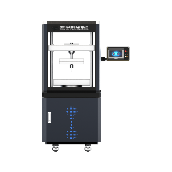 警用防刺服彎曲度測試儀測試壓頭以250mm/min±5 mm/min速度向下對防刺服施加壓力,分別記錄防刺服前片與后片在彎曲20mm時的壓力值,取其平均值作為彎曲度報出值