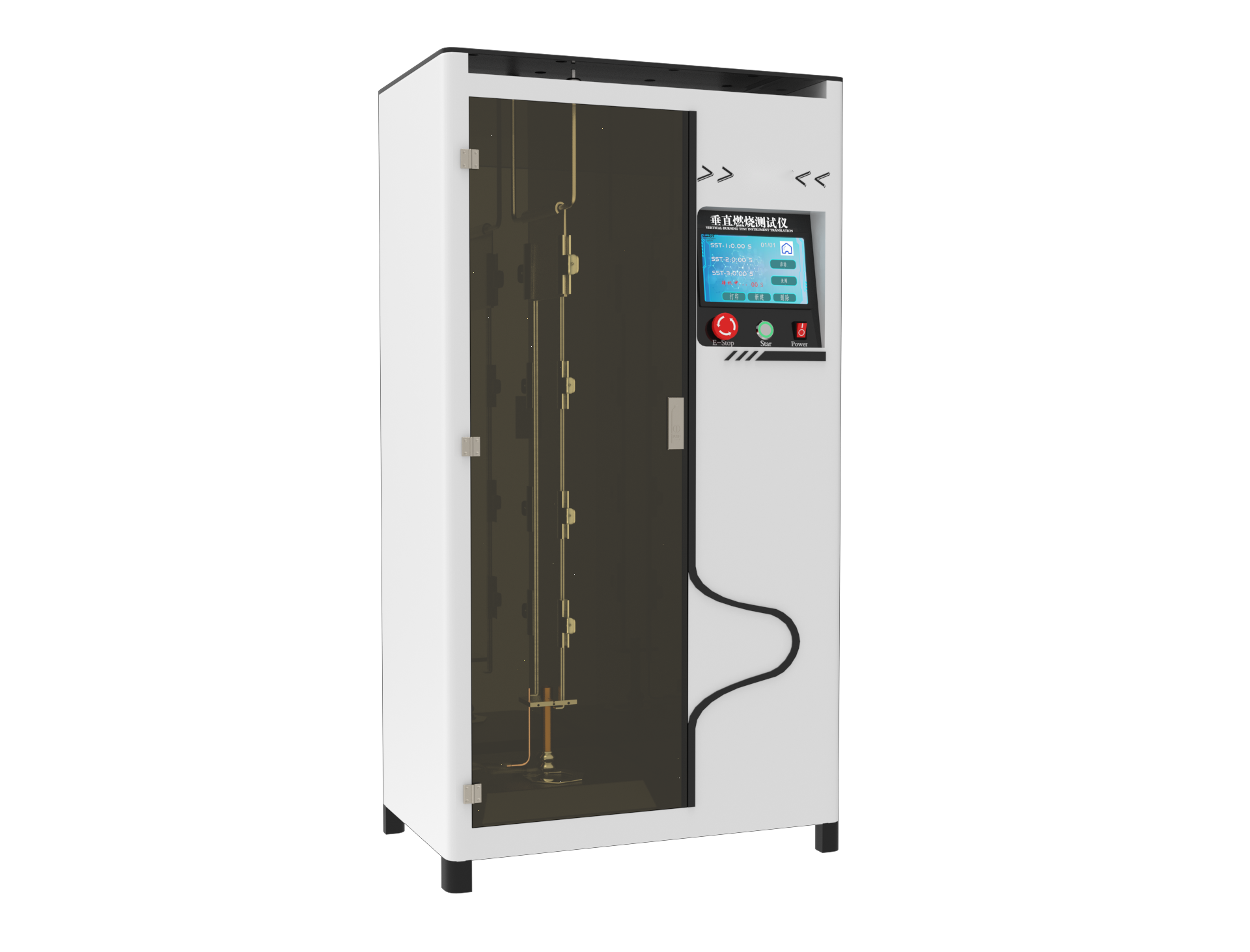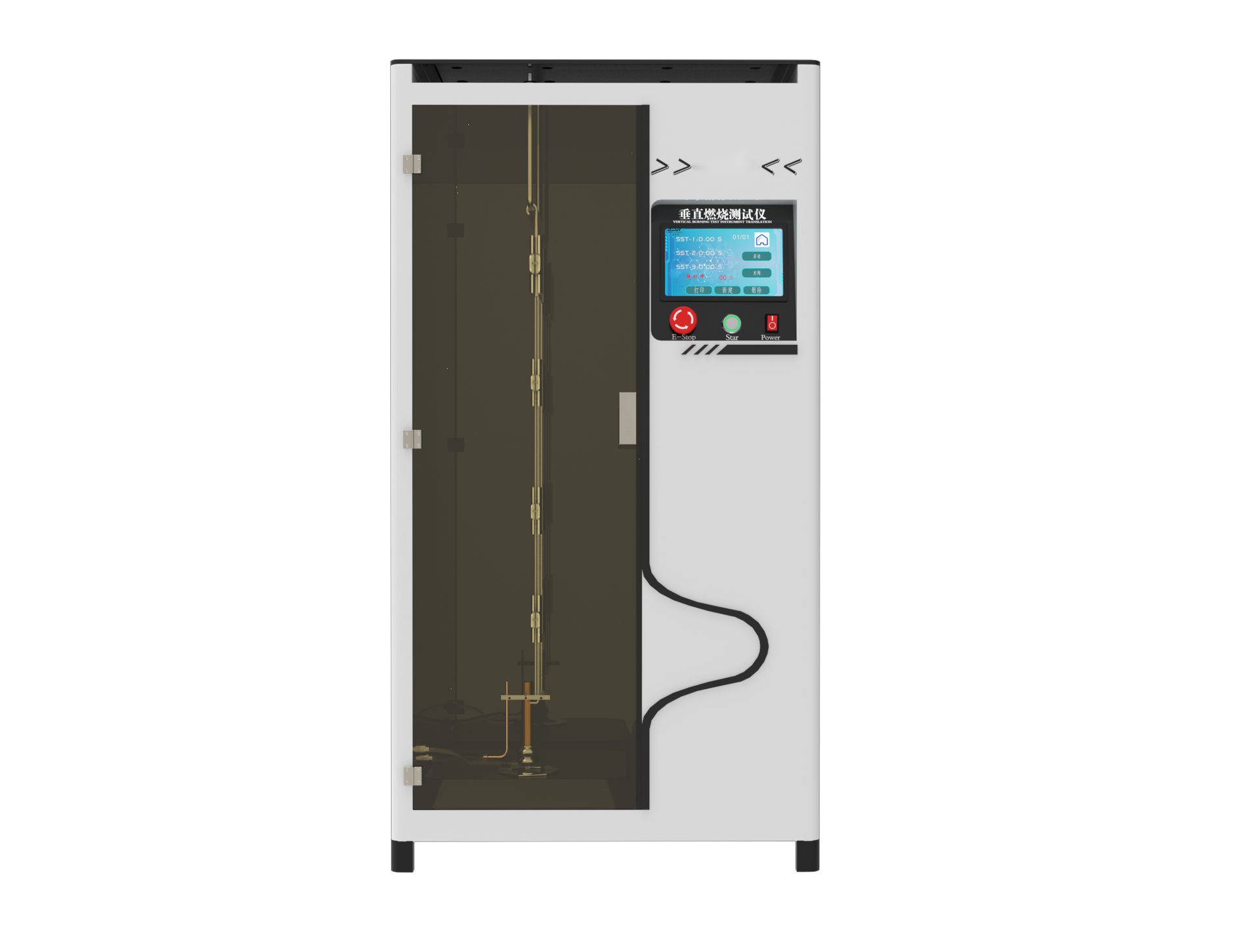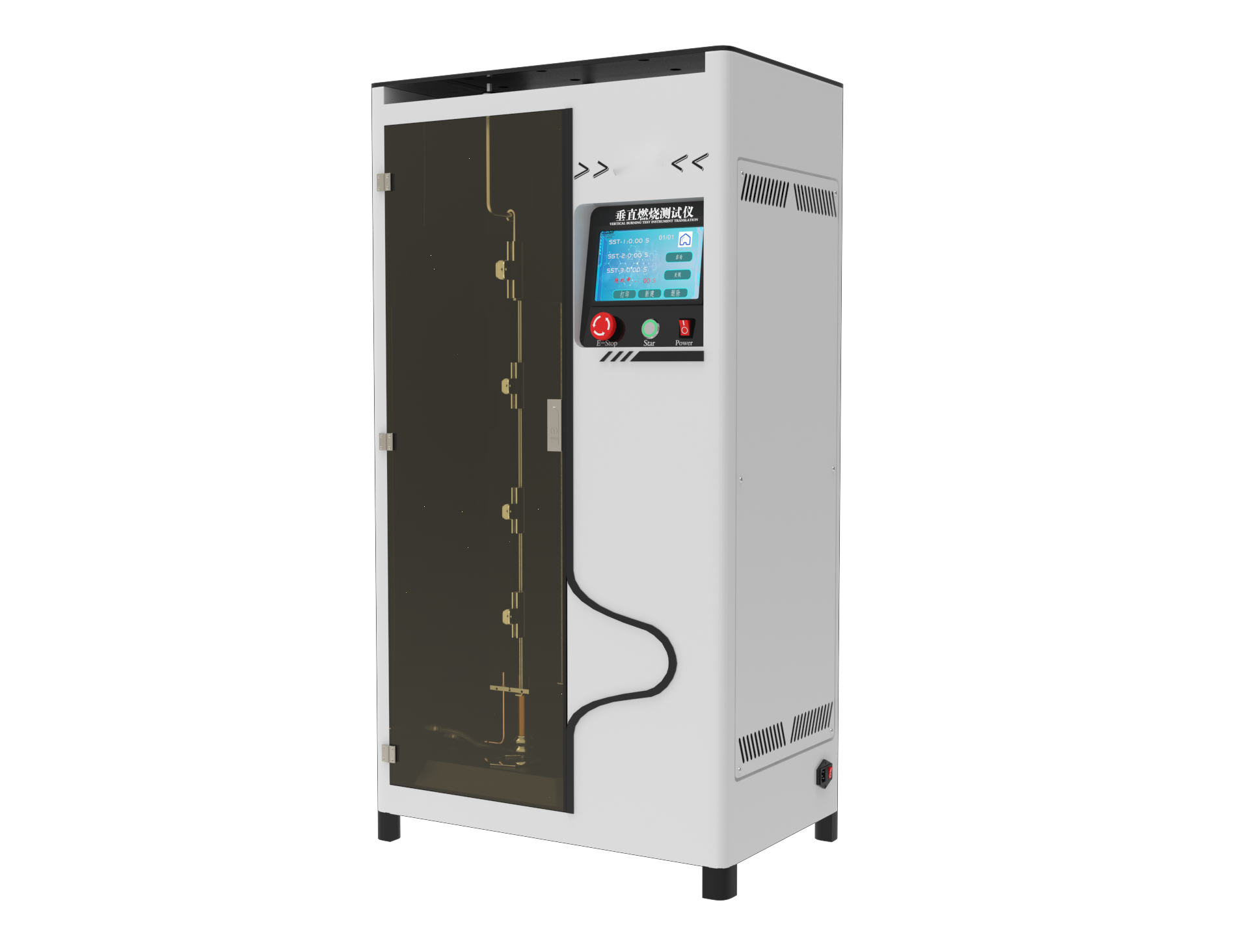 試驗時使用側(cè)燃燒器:將空試樣支架掛在VFC室的支撐桿上,將支架的后邊緣夾在從室后墻伸出的支架導(dǎo)軌上。將燃燒器管直接置于試樣中心下方,調(diào)整燃燒器上(燃燒室外)的止動環(huán)位置。將燃燒器滑出(向右)位置并點燃。根據(jù)試驗方法,根據(jù)燃燒室內(nèi)壁火焰高度計調(diào)整燃燒器火焰高度。如前所述,拆卸空試樣支架并將加載的試樣支架掛在腔內(nèi)。關(guān)閉艙門,按照適用的試驗方法進(jìn)行試驗